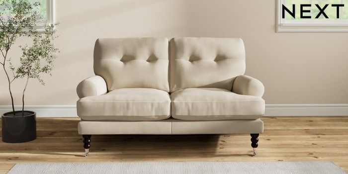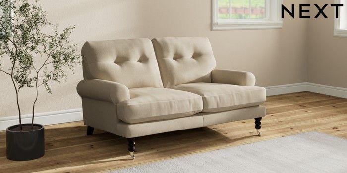 7.2.10 Erin Buttoned Back Deep Relaxed Sit 2 Seater Small Sofa Natural Mix Light Natural High Classic Turned Chrome Castor - Dark | Made Click here to use our website with more accessibility support, for example screen readers