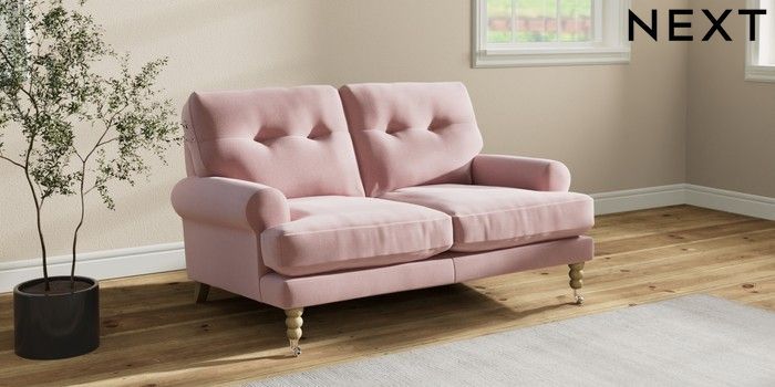 7.2.10 Erin Buttoned Back Deep Relaxed Sit 2 Seater Small Sofa Natural Mix Light Rose Pink High Classic Turned Chrome Castor - Light | Made Click here to use our website with more accessibility support, for example screen readers