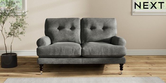 7.2.10 Erin Buttoned Back Deep Relaxed Sit 2 Seater Small Sofa Plush Chenille Dark Grey High Classic Turned Chrome Castor - Dark | Made Click here to use our website with more accessibility support, for example screen readers