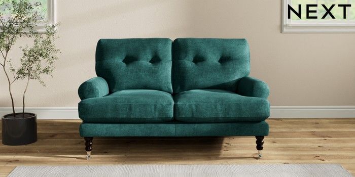 7.2.10 Erin Buttoned Back Deep Relaxed Sit 2 Seater Small Sofa Plush Chenille Dark Teal Green High Classic Turned Chrome Castor - Dark | Made Click here to use our website with more accessibility support, for example screen readers