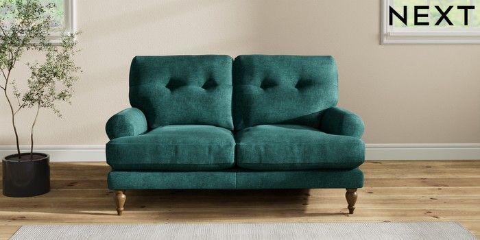 7.2.10 Erin Buttoned Back Deep Relaxed Sit 2 Seater Small Sofa Plush Chenille Dark Teal Green High Classic Turned - Mid | Made Click here to use our website with more accessibility support, for example screen readers