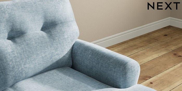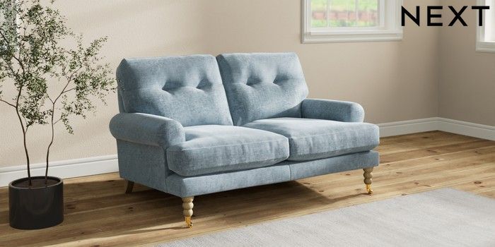 7.2.10 Erin Buttoned Back Deep Relaxed Sit 2 Seater Small Sofa Plush Chenille Light Blue High Classic Turned Brass Castor - Light | Made Click here to use our website with more accessibility support, for example screen readers