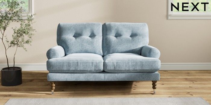 7.2.10 Erin Buttoned Back Deep Relaxed Sit 2 Seater Small Sofa Plush Chenille Light Blue High Classic Turned Chrome Castor - Mid | Made Click here to use our website with more accessibility support, for example screen readers
