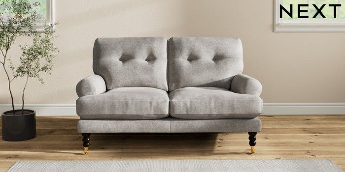 7.2.10 Erin Buttoned Back Deep Relaxed Sit 2 Seater Small Sofa Plush Chenille Light Grey High Classic Turned Brass Castor - Dark | Made Click here to use our website with more accessibility support, for example screen readers