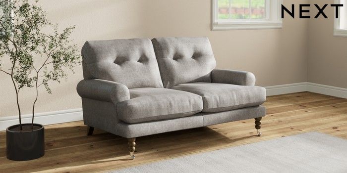 7.2.10 Erin Buttoned Back Deep Relaxed Sit 2 Seater Small Sofa Plush Chenille Light Grey High Classic Turned Chrome Castor - Mid | Made Click here to use our website with more accessibility support, for example screen readers