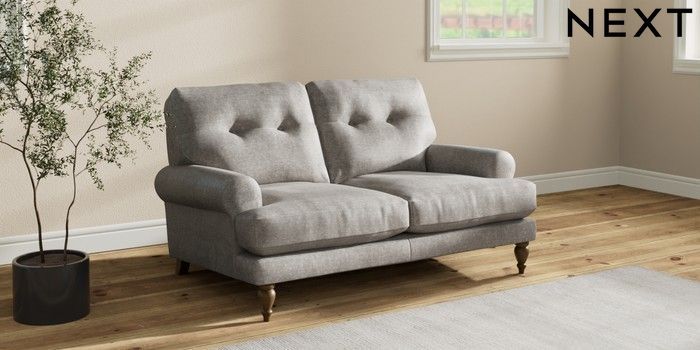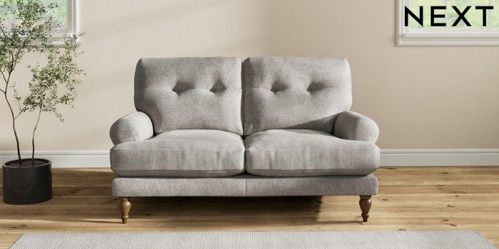 7.2.10 Erin Buttoned Back Deep Relaxed Sit 2 Seater Small Sofa Plush Chenille Light Grey High Classic Turned - Mid | Made Click here to use our website with more accessibility support, for example screen readers