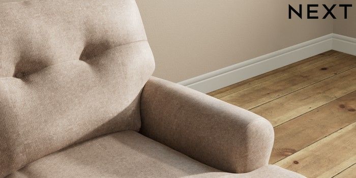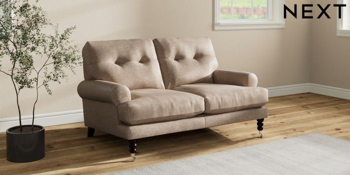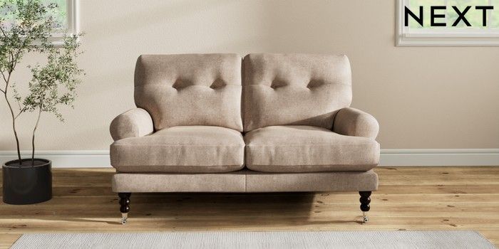 7.2.10 Erin Buttoned Back Deep Relaxed Sit 2 Seater Small Sofa Plush Chenille Mid Natural High Classic Turned Chrome Castor - Dark | Made Click here to use our website with more accessibility support, for example screen readers