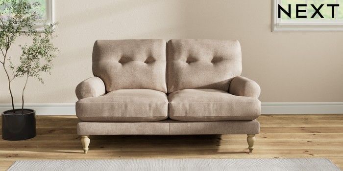 7.2.10 Erin Buttoned Back Deep Relaxed Sit 2 Seater Small Sofa Plush Chenille Mid Natural High Classic Turned - Light | Made Click here to use our website with more accessibility support, for example screen readers