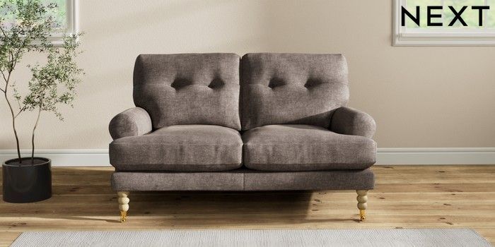 7.2.10 Erin Buttoned Back Deep Relaxed Sit 2 Seater Small Sofa Plush Chenille Mink Brown High Classic Turned Brass Castor - Light | Made Click here to use our website with more accessibility support, for example screen readers