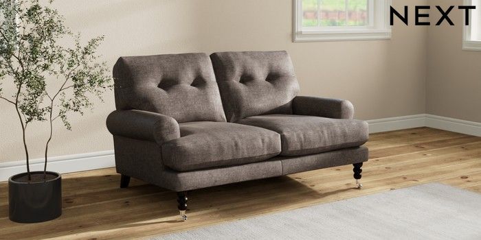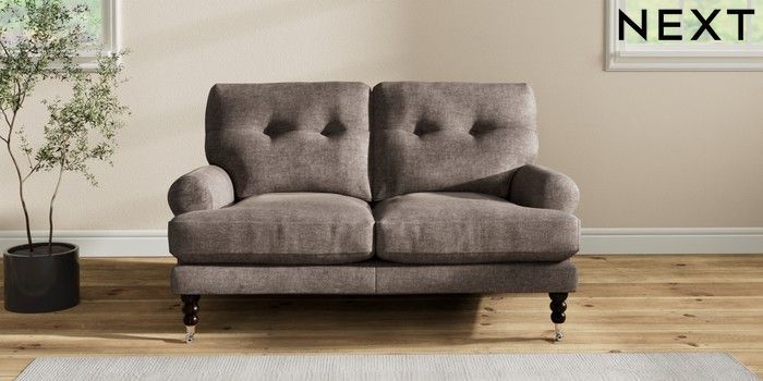 7.2.10 Erin Buttoned Back Deep Relaxed Sit 2 Seater Small Sofa Plush Chenille Mink Brown High Classic Turned Chrome Castor - Dark | Made Click here to use our website with more accessibility support, for example screen readers