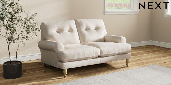 7.2.10 Erin Buttoned Back Deep Relaxed Sit 2 Seater Small Sofa Plush Chenille Oyster High Classic Turned - Light | Made Click here to use our website with more accessibility support, for example screen readers