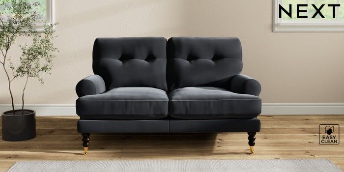 7.2.10 Erin Buttoned Back Deep Relaxed Sit 2 Seater Small Sofa Plush Velvet Easy Clean Charcoal Grey High Classic Turned Brass Castor - Dark | Made Click here to use our website with more accessibility support, for example screen readers