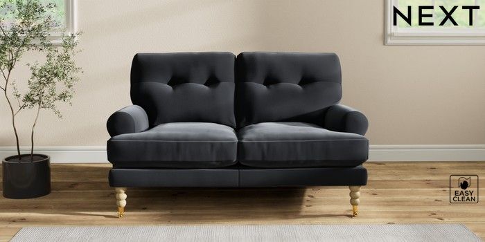7.2.10 Erin Buttoned Back Deep Relaxed Sit 2 Seater Small Sofa Plush Velvet Easy Clean Charcoal Grey High Classic Turned Brass Castor - Light | Made Click here to use our website with more accessibility support, for example screen readers