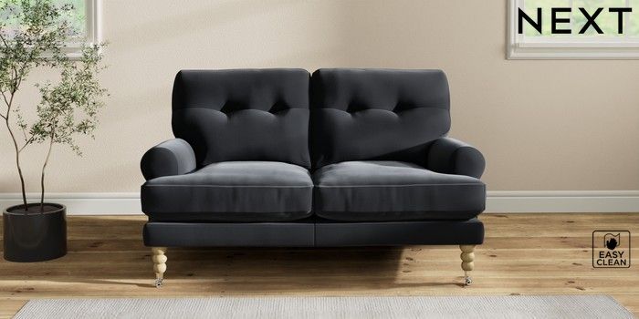 7.2.10 Erin Buttoned Back Deep Relaxed Sit 2 Seater Small Sofa Plush Velvet Easy Clean Charcoal Grey High Classic Turned Chrome Castor - Light | Made Click here to use our website with more accessibility support, for example screen readers