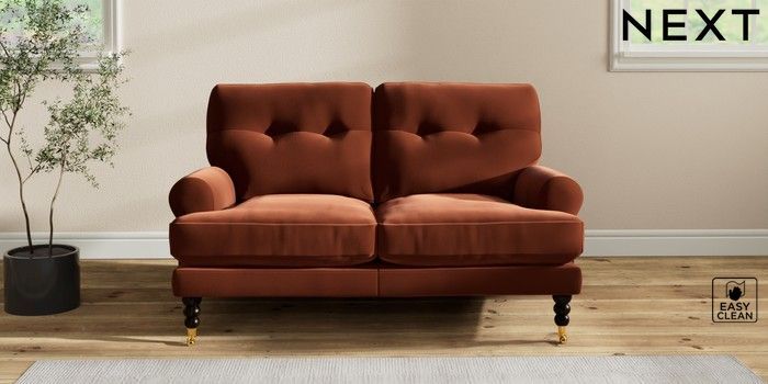 7.2.10 Erin Buttoned Back Deep Relaxed Sit 2 Seater Small Sofa Plush Velvet Easy Clean Ginger Orange High Classic Turned Brass Castor - Dark | Made Click here to use our website with more accessibility support, for example screen readers