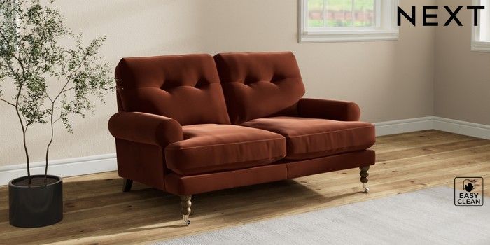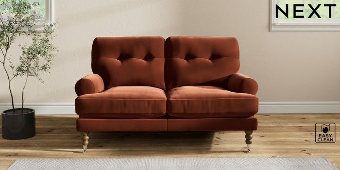 7.2.10 Erin Buttoned Back Deep Relaxed Sit 2 Seater Small Sofa Plush Velvet Easy Clean Ginger Orange High Classic Turned Chrome Castor - Mid | Made Click here to use our website with more accessibility support, for example screen readers