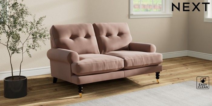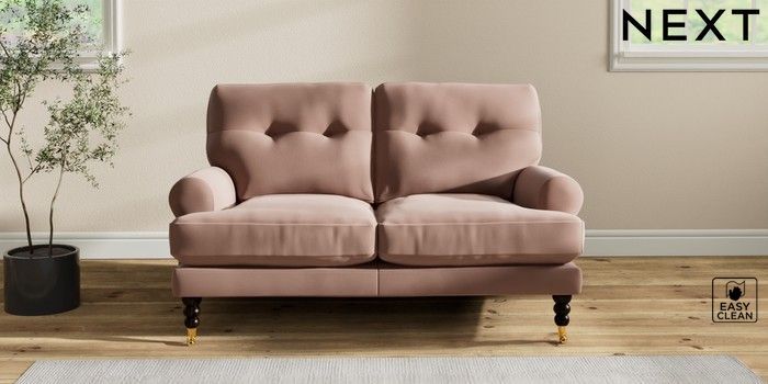 7.2.10 Erin Buttoned Back Deep Relaxed Sit 2 Seater Small Sofa Plush Velvet Easy Clean Mid Natural High Classic Turned Brass Castor - Dark | Made Click here to use our website with more accessibility support, for example screen readers