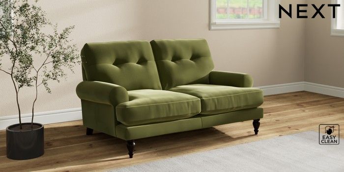 7.2.10 Erin Buttoned Back Deep Relaxed Sit 2 Seater Small Sofa Plush Velvet Easy Clean Mid Olive Green High Classic Turned - Dark | Made Click here to use our website with more accessibility support, for example screen readers