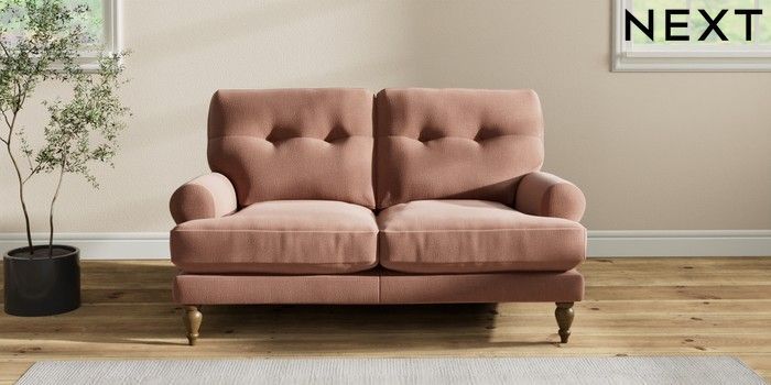 7.2.10 Erin Buttoned Back Deep Relaxed Sit 2 Seater Small Sofa Relaxed Linen Look Light Rust Brown High Classic Turned - Mid | Made Click here to use our website with more accessibility support, for example screen readers