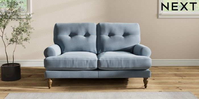 7.2.10 Erin Buttoned Back Deep Relaxed Sit 2 Seater Small Sofa Relaxed Linen Look Mid Blue High Classic Turned - Mid | Made Click here to use our website with more accessibility support, for example screen readers