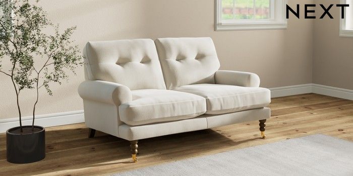 7.2.10 Erin Buttoned Back Deep Relaxed Sit 2 Seater Small Sofa Relaxed Linen Look Oyster High Classic Turned Brass Castor - Mid | Made Click here to use our website with more accessibility support, for example screen readers