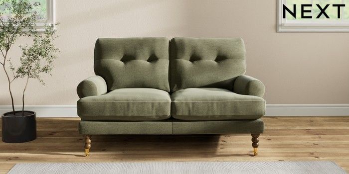 7.2.10 Erin Buttoned Back Deep Relaxed Sit 2 Seater Small Sofa Ripple Chenille Mid Moss Green High Classic Turned Brass Castor - Mid | Made Click here to use our website with more accessibility support, for example screen readers