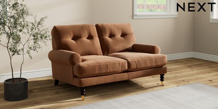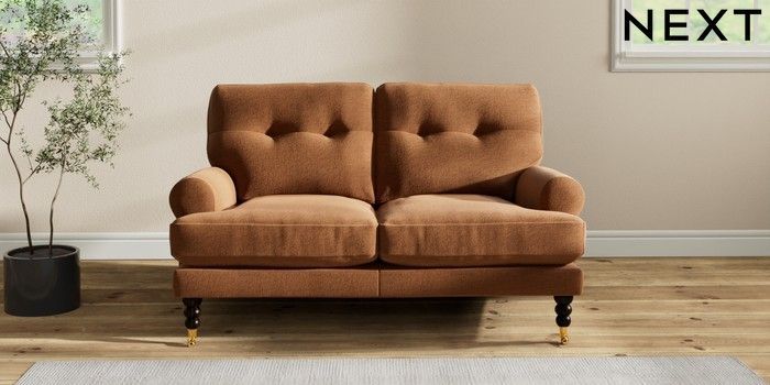 7.2.10 Erin Buttoned Back Deep Relaxed Sit 2 Seater Small Sofa Ripple Chenille Mid Rust Brown High Classic Turned Brass Castor - Dark | Made Click here to use our website with more accessibility support, for example screen readers