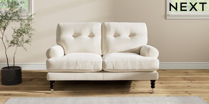 7.2.10 Erin Buttoned Back Deep Relaxed Sit 2 Seater Small Sofa Ripple Chenille Oyster High Classic Turned Chrome Castor - Dark | Made Click here to use our website with more accessibility support, for example screen readers