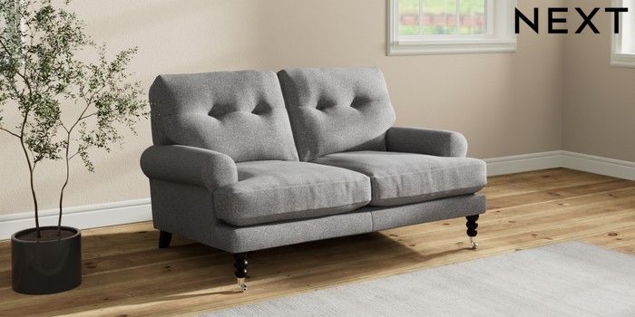 7.2.10 Erin Buttoned Back Deep Relaxed Sit 2 Seater Small Sofa Studio Chenille Mid Grey High Classic Turned Chrome Castor - Dark | Made Click here to use our website with more accessibility support, for example screen readers