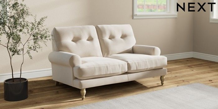 7.2.10 Erin Buttoned Back Deep Relaxed Sit 2 Seater Small Sofa Studio Chenille Oyster High Classic Turned - Light | Made Click here to use our website with more accessibility support, for example screen readers