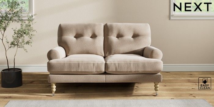 7.2.10 Erin Buttoned Back Deep Relaxed Sit 2 Seater Small Sofa Tweedy Blend Easy Clean Light Dove Natural High Classic Turned Chrome Castor - Light | Made Click here to use our website with more accessibility support, for example screen readers