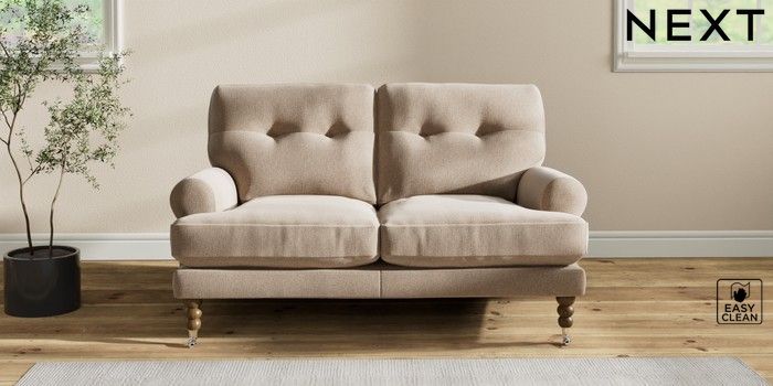 7.2.10 Erin Buttoned Back Deep Relaxed Sit 2 Seater Small Sofa Tweedy Blend Easy Clean Light Dove Natural High Classic Turned Chrome Castor - Mid | Made Click here to use our website with more accessibility support, for example screen readers