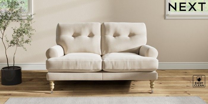 7.2.10 Erin Buttoned Back Deep Relaxed Sit 2 Seater Small Sofa Tweedy Blend Easy Clean Oyster High Classic Turned Chrome Castor - Light | Made Click here to use our website with more accessibility support, for example screen readers
