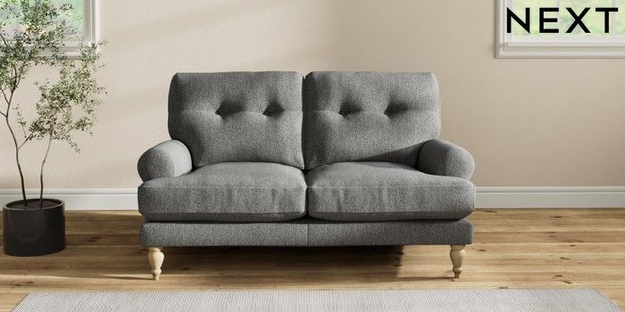 7.2.10 Erin Buttoned Back Deep Relaxed Sit 2 Seater Small Sofa Tweedy Chenille Dark Grey High Classic Turned - Light | Made Click here to use our website with more accessibility support, for example screen readers