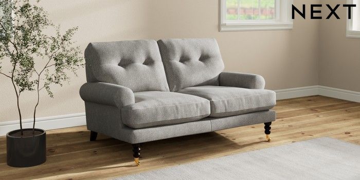 7.2.10 Erin Buttoned Back Deep Relaxed Sit 2 Seater Small Sofa Tweedy Chenille Mid Grey High Classic Turned Brass Castor - Dark | Made Click here to use our website with more accessibility support, for example screen readers