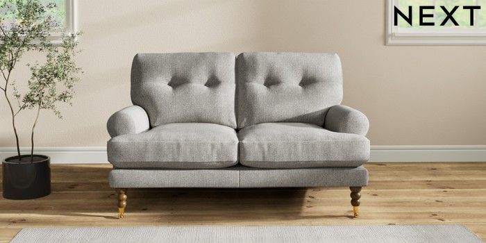 7.2.10 Erin Buttoned Back Deep Relaxed Sit 2 Seater Small Sofa Tweedy Chenille Mid Grey High Classic Turned Brass Castor - Mid | Made Click here to use our website with more accessibility support, for example screen readers