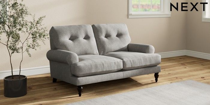 7.2.10 Erin Buttoned Back Deep Relaxed Sit 2 Seater Small Sofa Tweedy Chenille Mid Grey High Classic Turned - Dark | Made Click here to use our website with more accessibility support, for example screen readers