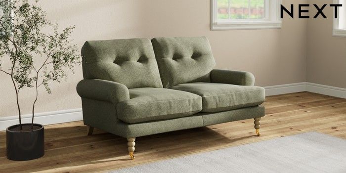 7.2.10 Erin Buttoned Back Deep Relaxed Sit 2 Seater Small Sofa Tweedy Chenille Mid Moss Green High Classic Turned Brass Castor - Light | Made Click here to use our website with more accessibility support, for example screen readers