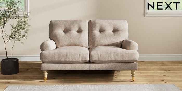 7.2.10 Erin Buttoned Back Deep Relaxed Sit 2 Seater Small Sofa Tweedy Chenille Mid Natural High Classic Turned Brass Castor - Light | Made Click here to use our website with more accessibility support, for example screen readers