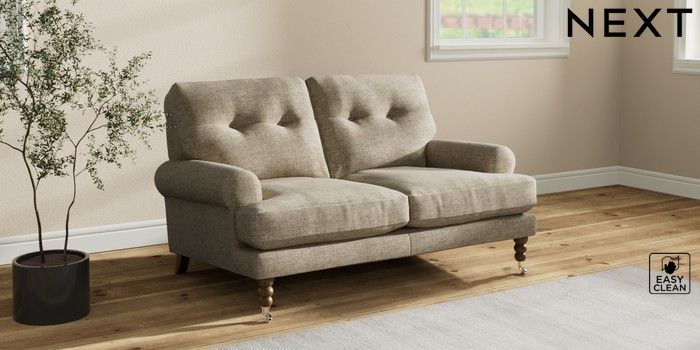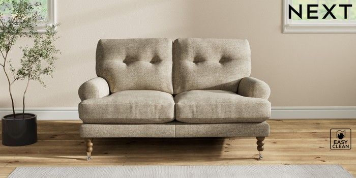 7.2.10 Erin Buttoned Back Deep Relaxed Sit 2 Seater Small Sofa Woven Chenille Easy Clean Mid Natural High Classic Turned Chrome Castor - Mid | Made Click here to use our website with more accessibility support, for example screen readers