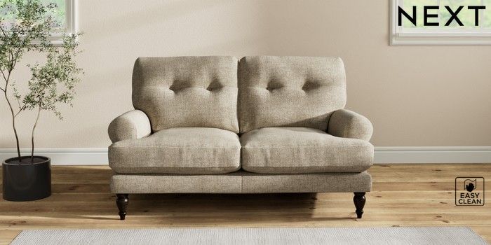 7.2.10 Erin Buttoned Back Deep Relaxed Sit 2 Seater Small Sofa Woven Chenille Easy Clean Mid Natural High Classic Turned - Dark | Made Click here to use our website with more accessibility support, for example screen readers