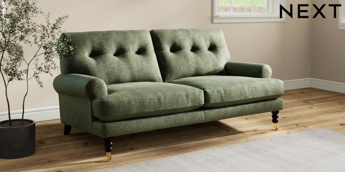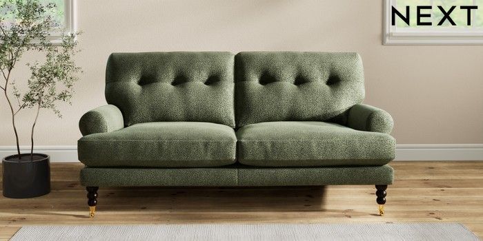7.2.10 Erin Buttoned Back Deep Relaxed Sit 3 Seater Small Sofa Boucle Chenille Dark Moss Green High Classic Turned Brass Castor - Dark | Made Click here to use our website with more accessibility support, for example screen readers