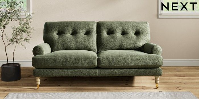 7.2.10 Erin Buttoned Back Deep Relaxed Sit 3 Seater Small Sofa Boucle Chenille Dark Moss Green High Classic Turned Brass Castor - Light | Made Click here to use our website with more accessibility support, for example screen readers