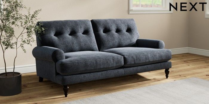 7.2.10 Erin Buttoned Back Deep Relaxed Sit 3 Seater Small Sofa Boucle Chenille Dark Slate Blue High Classic Turned - Dark | Made Click here to use our website with more accessibility support, for example screen readers