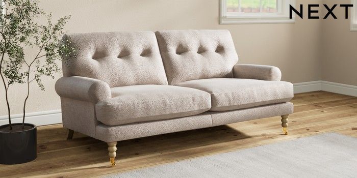 7.2.10 Erin Buttoned Back Deep Relaxed Sit 3 Seater Small Sofa Boucle Chenille Light Natural High Classic Turned Brass Castor - Light | Made Click here to use our website with more accessibility support, for example screen readers