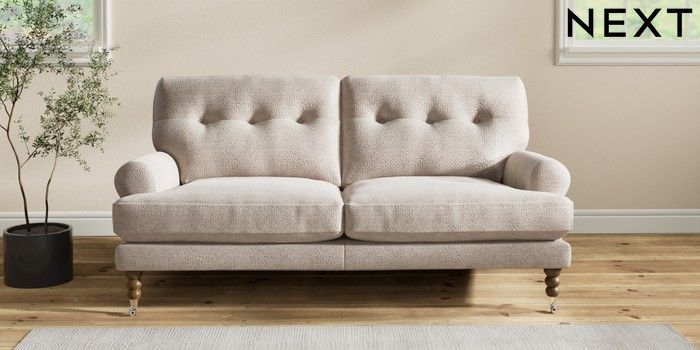7.2.10 Erin Buttoned Back Deep Relaxed Sit 3 Seater Small Sofa Boucle Chenille Light Natural High Classic Turned Chrome Castor - Mid | Made Click here to use our website with more accessibility support, for example screen readers