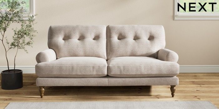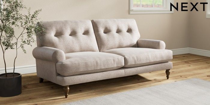 7.2.10 Erin Buttoned Back Deep Relaxed Sit 3 Seater Small Sofa Boucle Chenille Light Natural High Classic Turned - Mid | Made Click here to use our website with more accessibility support, for example screen readers