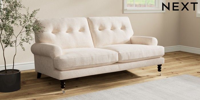 7.2.10 Erin Buttoned Back Deep Relaxed Sit 3 Seater Small Sofa Boucle Chenille Oyster High Classic Turned Chrome Castor - Dark | Made Click here to use our website with more accessibility support, for example screen readers