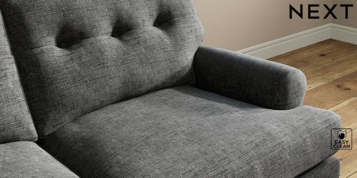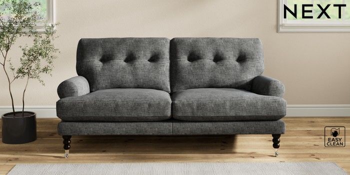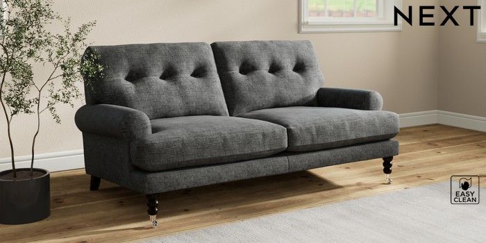 7.2.10 Erin Buttoned Back Deep Relaxed Sit 3 Seater Small Sofa Boucle Weave Easy Clean Charcoal Grey High Classic Turned Chrome Castor - Dark | Made Click here to use our website with more accessibility support, for example screen readers