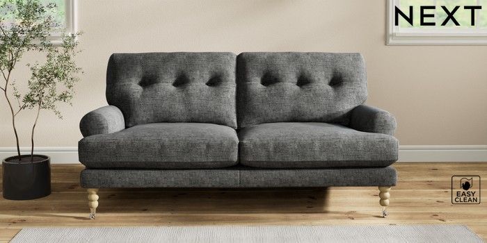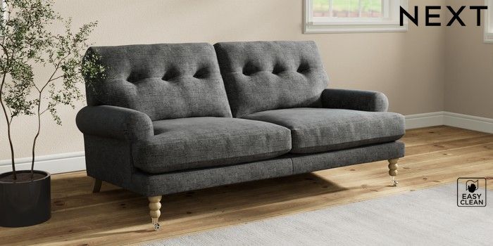 7.2.10 Erin Buttoned Back Deep Relaxed Sit 3 Seater Small Sofa Boucle Weave Easy Clean Charcoal Grey High Classic Turned Chrome Castor - Light | Made Click here to use our website with more accessibility support, for example screen readers
